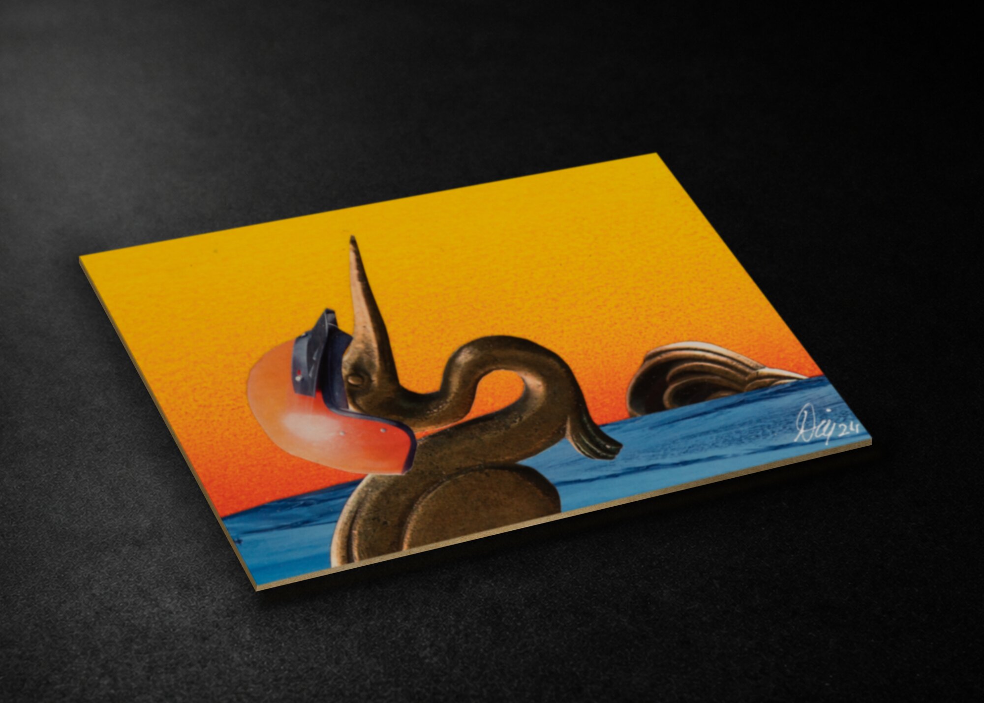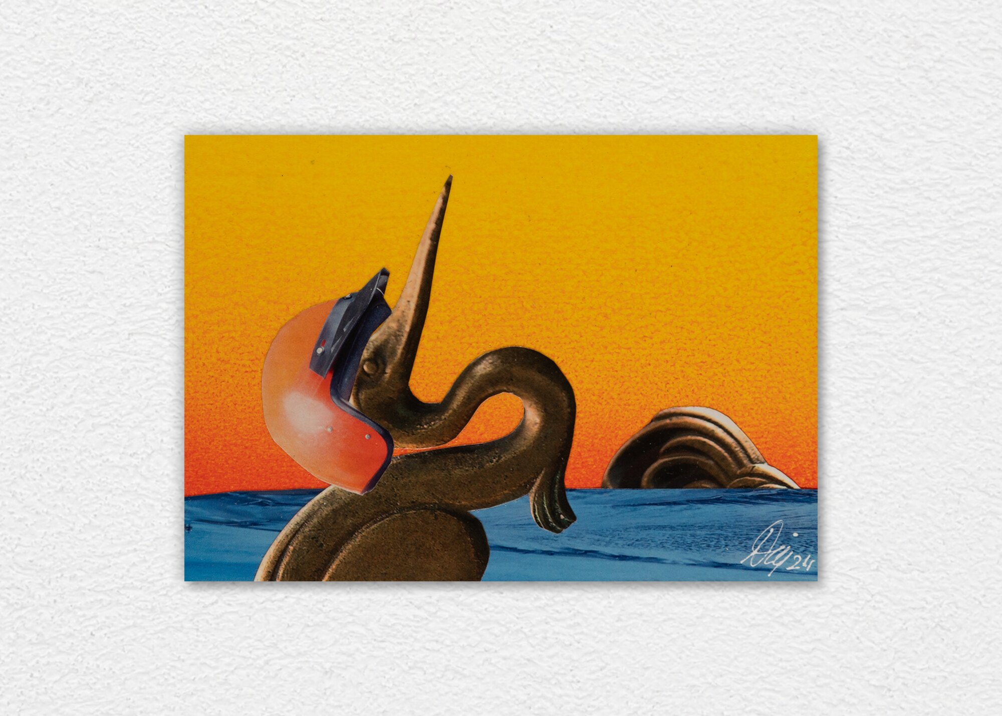 Signed unique piece from 2025 in A6 format (10.5 × 14.8 cm) on 3 mm cardboard. Original collage with a hand-painted acrylic background, sealed with UV varnish, and sold unframed. Carefully packaged and securely shipped.