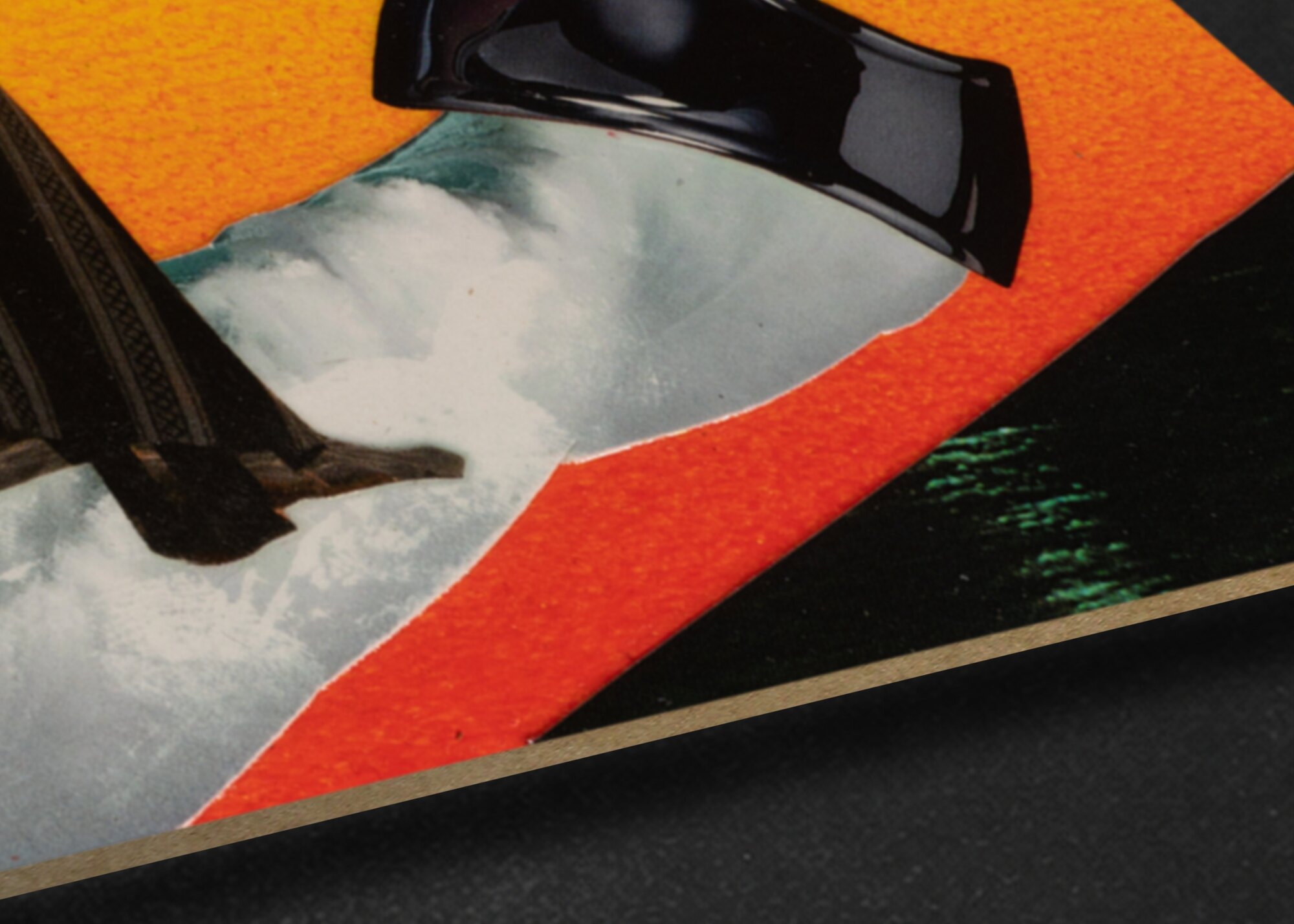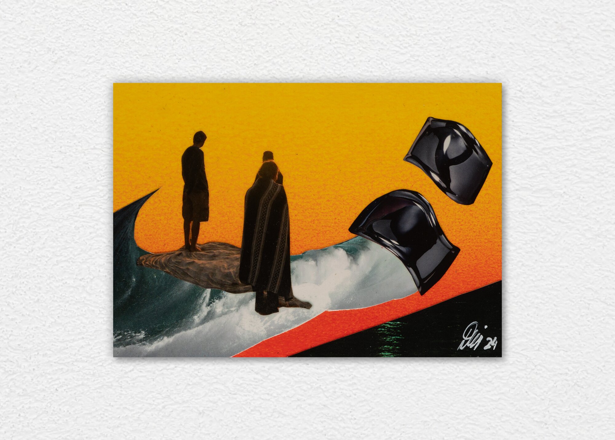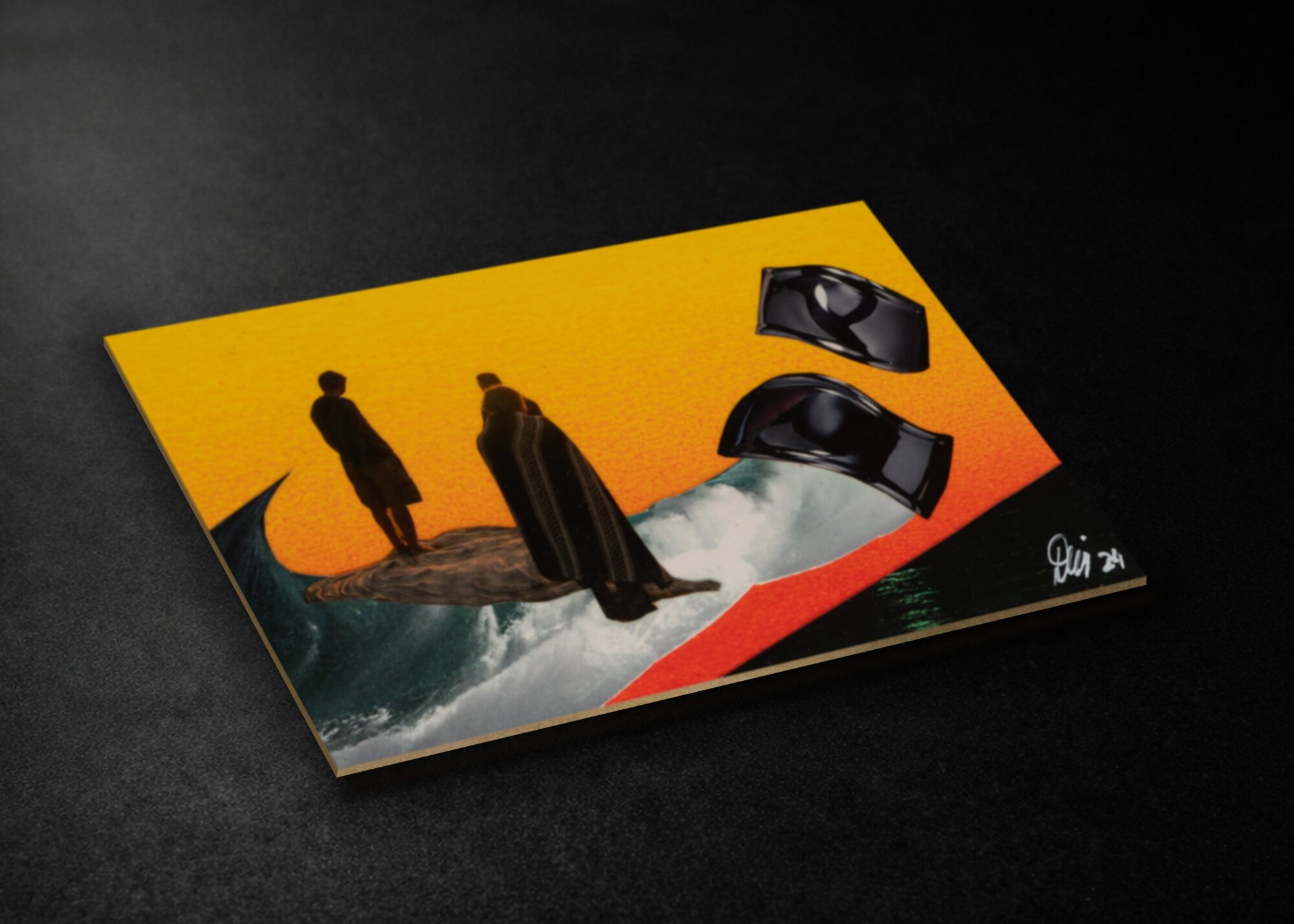 Signed unique piece from 2025 in A6 format (10.5 × 14.8 cm) on 3 mm cardboard. Original collage with a hand-painted acrylic background, sealed with UV varnish, and sold unframed. Carefully packaged and securely shipped.